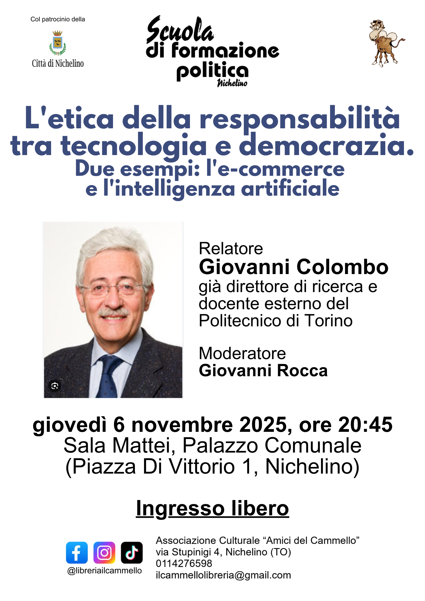Nell’incontro, dopo un richiamo all’etica della responsabilità, Giovanni Colombo analizzerà due casi resi possibili dai recenti sviluppi delle tecnologie informatiche: la distribuzione dei beni di consumo basata sull’e-commerce; l’uso dell’intelligenza artificiale generativa nel campo del linguaggio naturale.