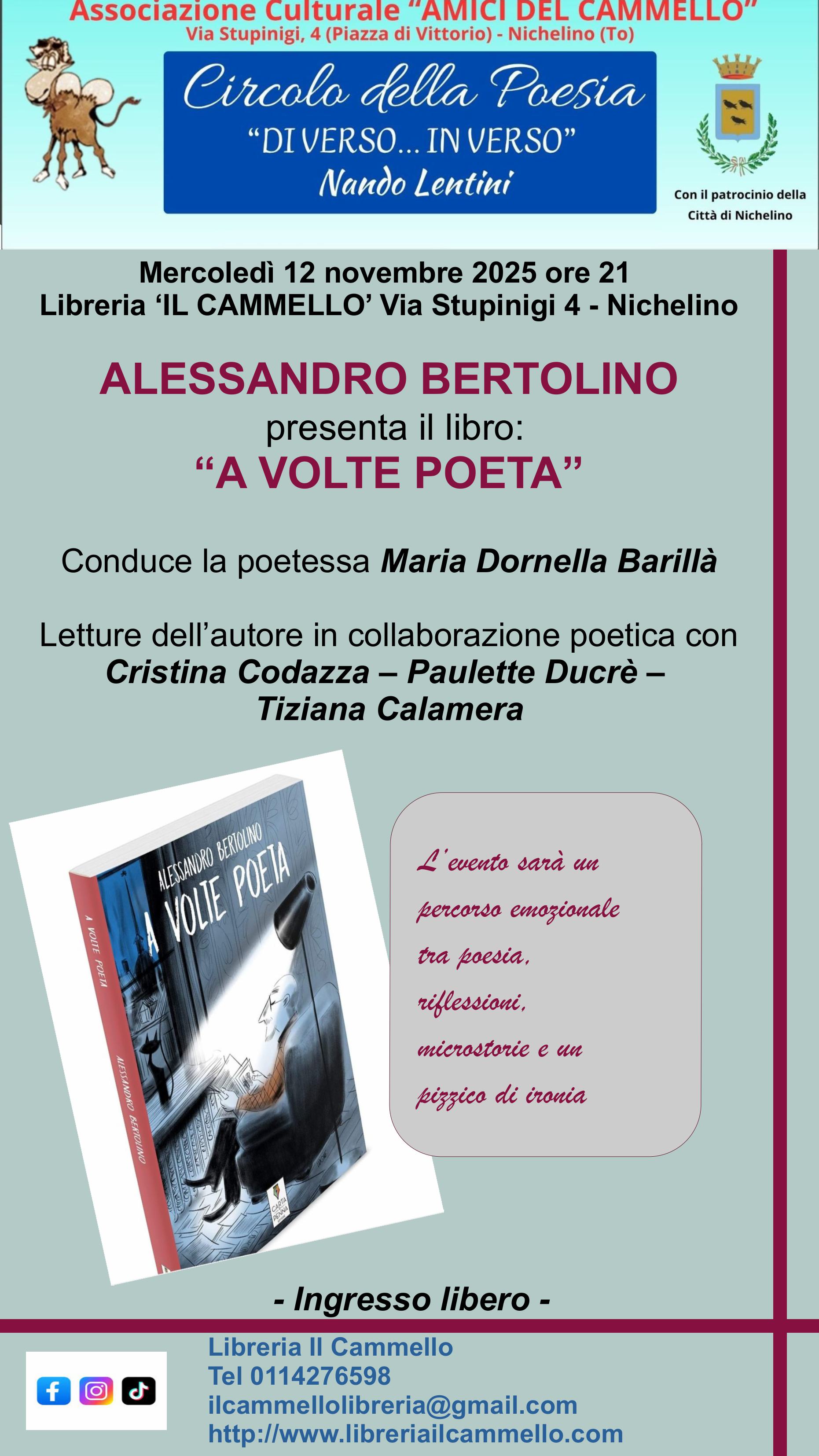 Il Circolo della Poesia "di verso.. in verso" vi aspetta insieme ad Alessandro Bertolino per la presentazione del suo libro "A volte Poeta". Vi aspettiamo mercoledì 12 novembre alle ore 21.00 presso la libreria "Il Cammello" in via Stupinigi 4, Nichelino (TO).