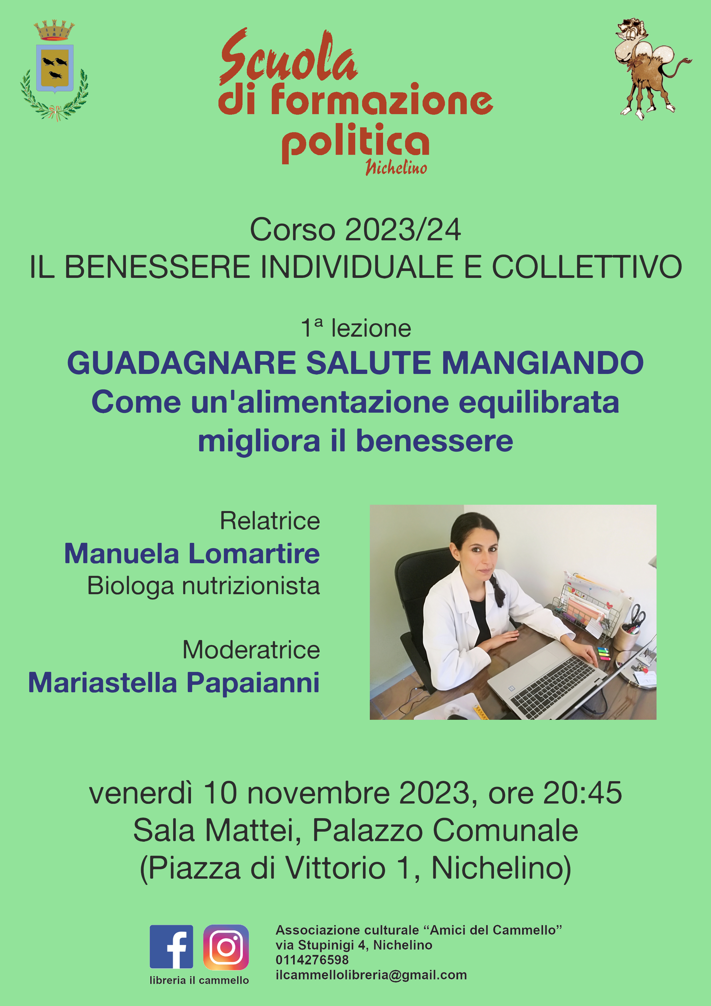 Venerdì 10 novembre alle ore 20:45, Municipio - Sala Mattei (P.zza Di Vittorio, 1 - Nichelino) 1ª lezione: “Guadagnare salute mangiando. Come un’alimentazione equilibrata migliora il benessere” con la biologa nutrizionista Manuela Lomartire, modera Mariastella Papaianni.