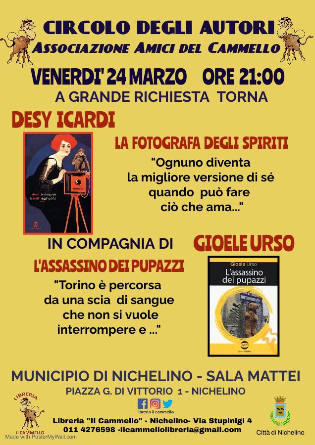 Venerdì 24 marzo alle ore 21 presso la Sala Mattei del Municipio di Nichelino (Piazza Di Vittorio 1) ritorno straordinario di DESY ICARDI, al Circolo degli Autori dell’Associazione, con il suo ultimo libro “La fotografa degli spiriti”, della pentalogia sui 5 sensi. Ci sarà con lei lo scrittore torinese Gioele Urso che presenterà il suo romanzo “L’assassino dei pupazzi”.