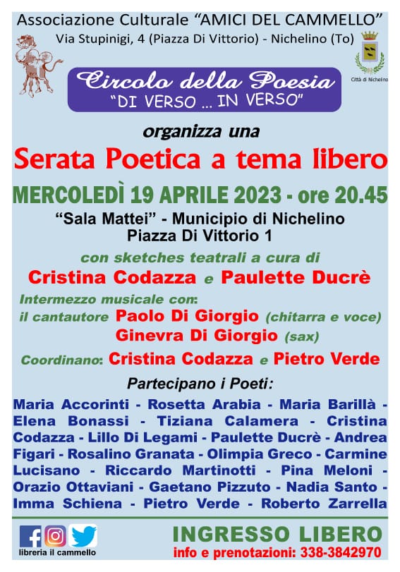 Mercoledì 19 aprile alle ore 20:45 presso la Sala Mattei del Municipio di Nichelino il Circolo della Poesia "Di verso...In verso" organizza una serata poetica a tema libero.