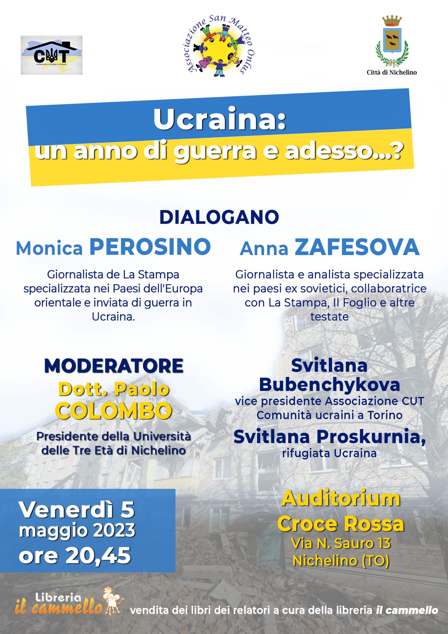 Venerdì 5 maggio alle ore 20.45 presso l’Auditorium della Croce Rossa di Nichelino in via Sauro 13, l’Associazione San Matteo Onlus organizza una serata divulgativa sul conflitto in Ucraina dopo più di un anno di guerra.