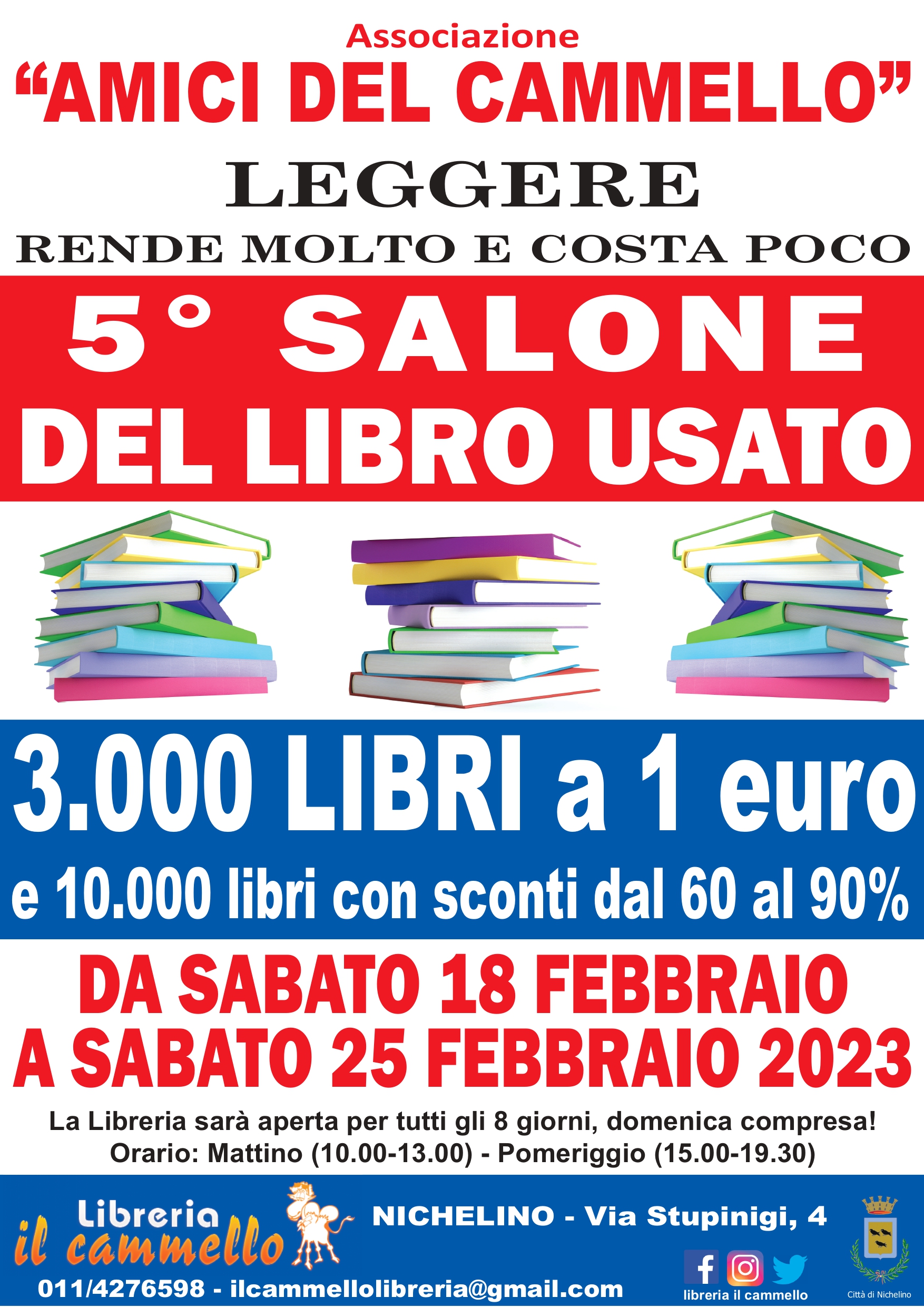 Una grande occasione DA NON PERDERE per tutti gli amanti della lettura e lettori di qualsiasi genere! Saremo aperti TUTTI I GIORNI (domenica compresa) con il seguente orario: al mattino dalle 10.00 alle 13.00 e al pomeriggio dalle 15.00 alle 19.30, a Nichelino (TO) in via Stupinigi 4.