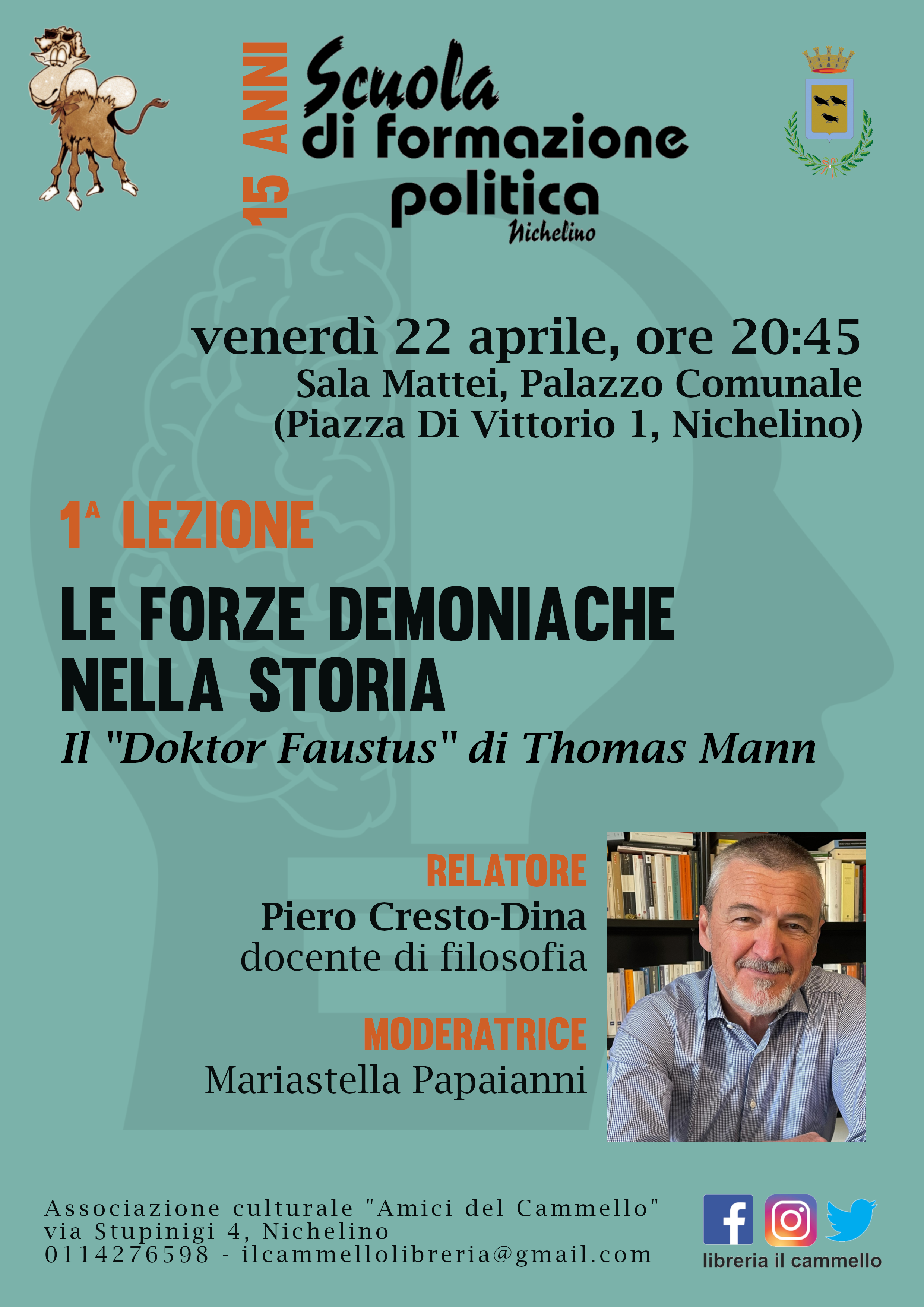 Venerdì affronteremo il binomio Politica-Letteratura, con il Prof. Piero Cresto-Dina parleremo, attraverso Thomas Mann e il suo Doctor Faustus, delle forze demoniache nella storia. Modera la serata: Mariastella Papaianni.
