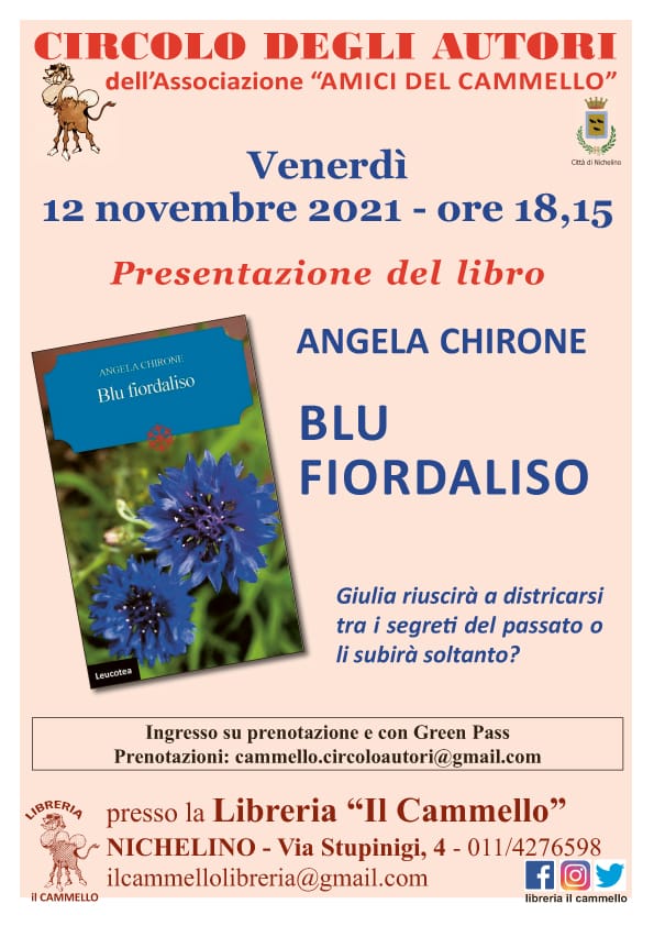 Venerdì 12 novembre alle ore 18:15 presso la Libreria Il Cammello la presentazione dell'ultimo libro di Angela Chirone "Blu fiordaliso".