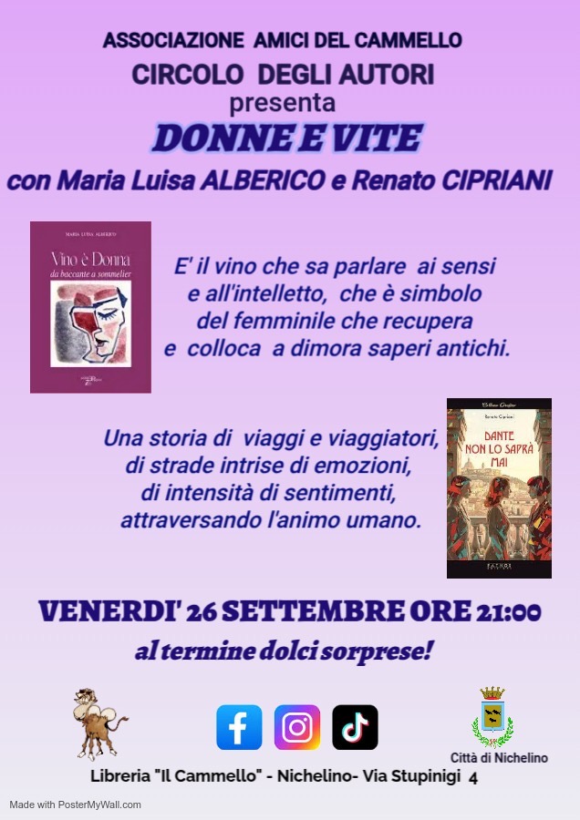 Volete fare un viaggio sensoriale al sapore di vino? Provare intense emozioni scavando nell'animo umano? L'autrice Maria Luisa Alberico presenterà il suo libro "Vino è Donna"; l'autore Renato Cipriani presenterà il suo libro "Dante non lo saprà mai".. Vi aspettiamo venerdì 26 settembre alle 21.00 presso la libreria "il Cammello" via Stupinigi 4 Nichelino (TO).