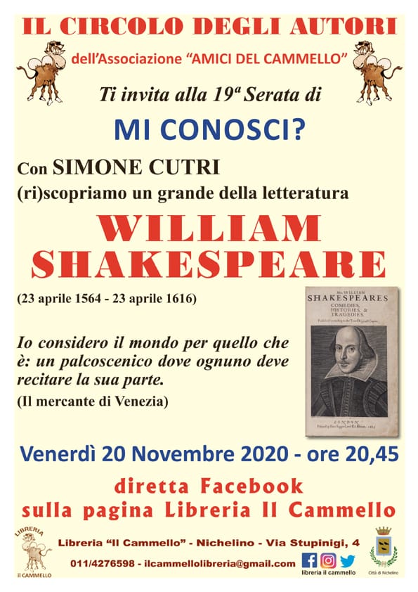 Venerdì 20 novembre alle ore 20:45, in diretta sulla nostra pagina Facebook Libreria Il Cammello, riscopriremo con Simone Cutri, professore di lettere e scrittore, uno dei più grandi artisti della letteratura mondiale: William Shakespeare. Ti aspettiamo online!