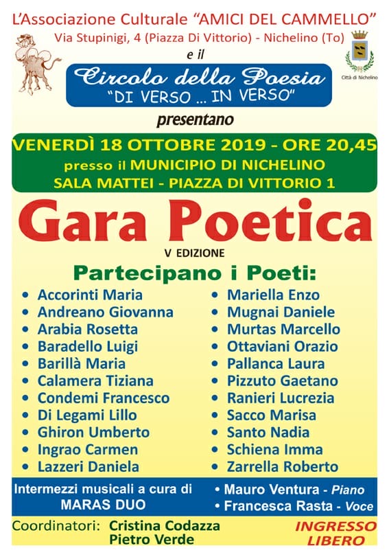 Torna la Gara Poetica dopo il grande successo degli anni precedenti. Ventidue poeti si sfideranno a colpi di rime e versi in una serata scoppiettante. Venerdì 18 Ottobre alle ore 20:45 Vi Aspettiamo in Sala Mattei