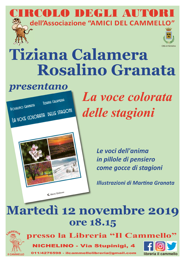Tiziana Calamera e Rosalino Granata presentano il loro libro: "La voce colorata delle stagioni". A cura del Circolo degli Autori. Martedì 12 /11 alle ore 18:15 presso la Libreria il Cammello