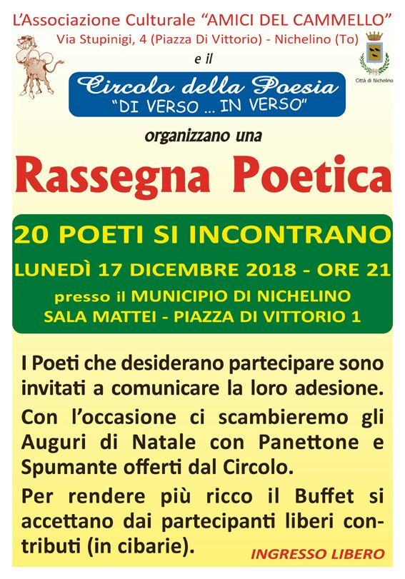 Lunedì 17 Dicembre 20 poeti del Circolo della poesia si incontrano presso la Sala Comunale Mattei alle ore 21:00, per scambiarsi gli auguri e mangiare in compagnia. Non può mancare la declamazione di tante poesie.