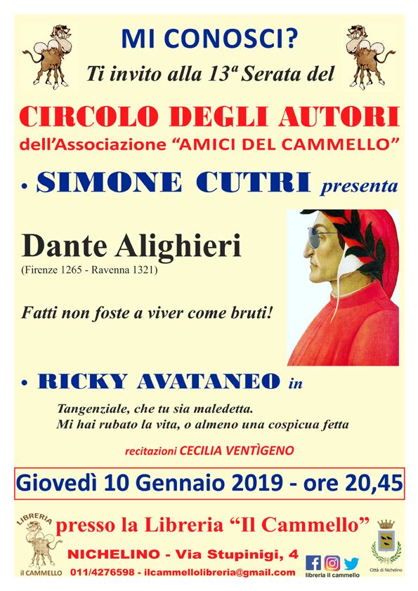 Anno nuovo, nuove eventi in serbo per voi. Iniziamo Giovedì 10 Gennaio alle ore 20:45. L'autore Simone Cutri presenta Dante Alighieri.
