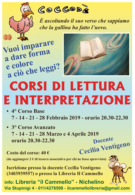 L’Associazione Amici del Cammello propone per il quarto anno consecutivo un Corso di Lettura ed Interpretazione, tenuto dall’esperta Cecilia Ventigeno, per coloro i quali vogliano imparare a leggere ad alta voce e a dare forma e colore a ciò che leggono!!!